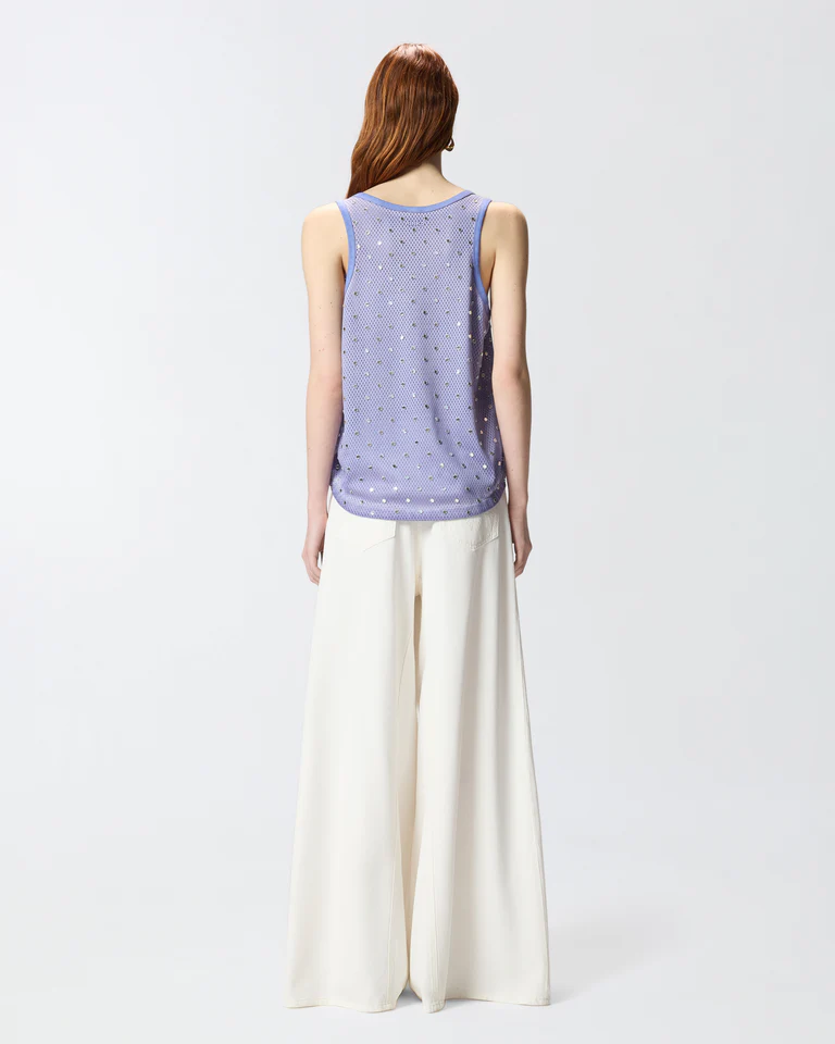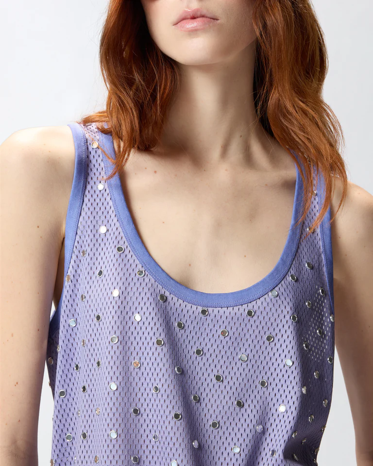 Canotta con scollo tondo realizzata in tessuto a rete dal gusto sportivo. Il bordo di scollo e giromanica è realizzato in jersey tinto in capo dall’effetto sfumato che, per contrasto, valorizza la texture inaspettata del capo, arricchita da piccoli specchietti circolari applicati all over. Indossa la canotta con gli shorts abbinati per un total look sporty-chic, oppure con un paio di jeans per uno stile casual che non rinuncia al tocco glamour in puro stile PINKO.
