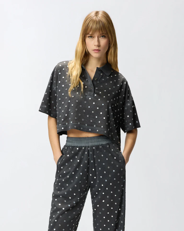 Polo dal taglio cropped realizzata in jersey con una finitura dall’effetto leggermente scolorito. Il modello è caratterizzato da una lavorazione a rete d’ispirazione basket ed è impreziosito da una pioggia di specchietti circolari all over. Indossa questo capo con i tuoi jeans preferiti o con pantaloni coordinati in versione total look, per uno stile contemporaneo che non rinuncia alla femminilità