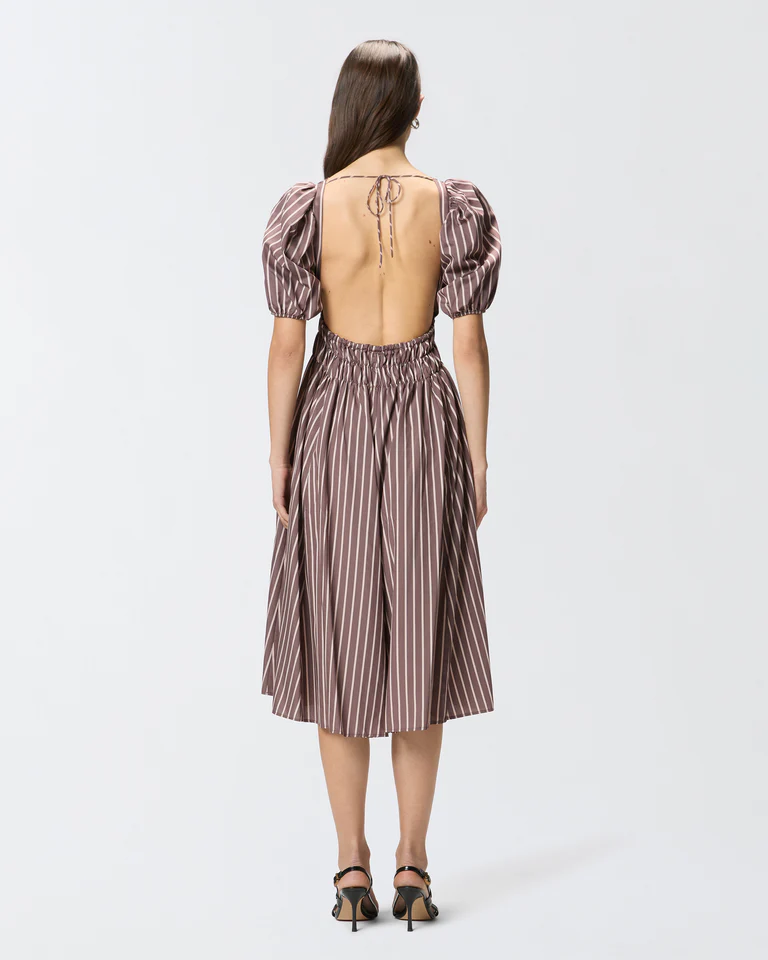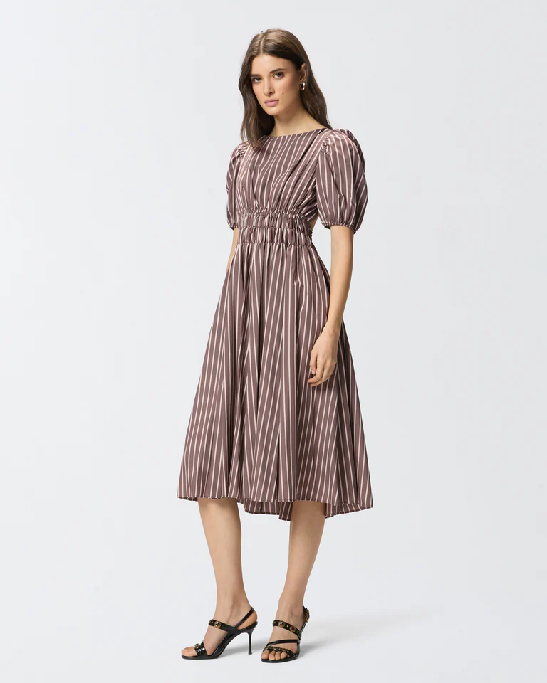 Abito midi con scollo a barchetta frontale e ampie mezze maniche a palloncino con bordo elasticizzato. Realizzato in un tessuto fluido di viscosa tinto in filo con motivo a righe verticali, il capo è reso speciale dalla fascia in vita arricciata che dà origine a una gonna svasata con morbide pieghe, e dal retro, caratterizzato da nastrini da annodare dietro al collo e da un profondo scollo squadrato che lascia la schiena scoperta. Il modello è foderato per assicurare un maggiore comfort durante l’indosso. Questo vestito diventerà il tuo alleato ideale sia per un look da giorno femminile, con un paio di scarpe basse, sia per una serata speciale, con un paio di décolleté.
