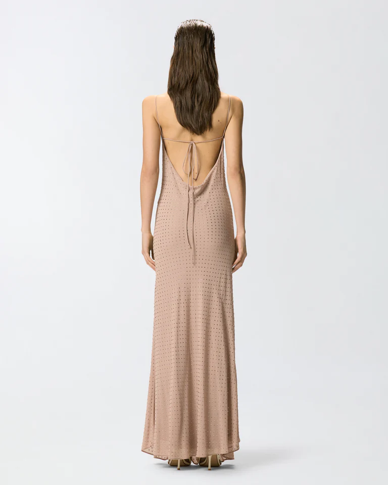 Abito lungo dalla silhouette a sottoveste con spalline sottili, morbido scollo frontale drappeggiato e ampio scollo tondo sul retro che lascia la schiena scoperta, attraversata solo da due nastrini da annodare al centro. Il modello è realizzato in un tessuto georgette dal raffinato aspetto opaco che accompagna il corpo con delicatezza e permette di ottenere una silhouette fluida e leggera, ed è impreziosito da brillanti strass disposti su tutta la superficie del capo, perfetta espressione del DNA PINKO. Questo vestito, femminile ma dalla personalità decisa, è destinato a diventare il protagonista assoluto dei tuoi look per serate speciali e cerimonie esclusive. – FARRO ABITI
