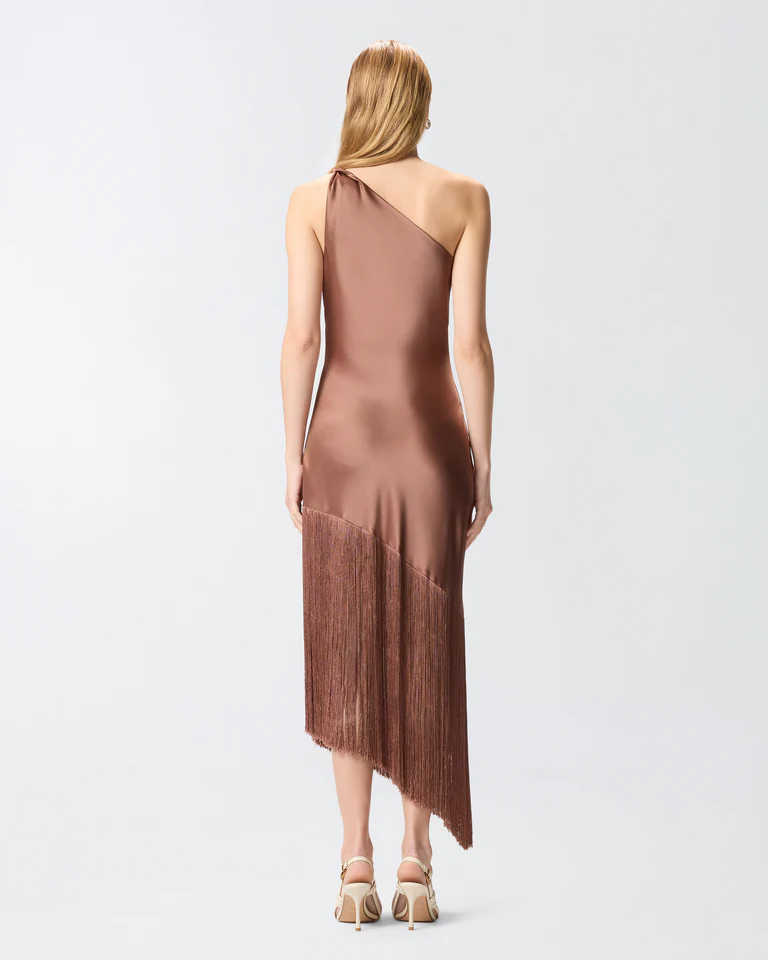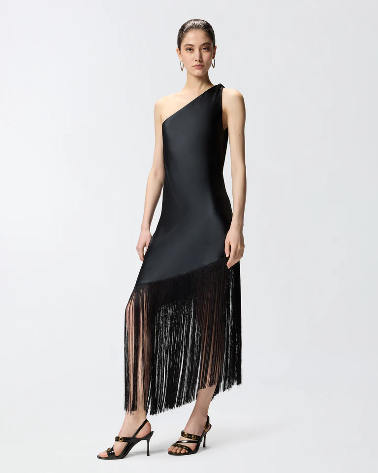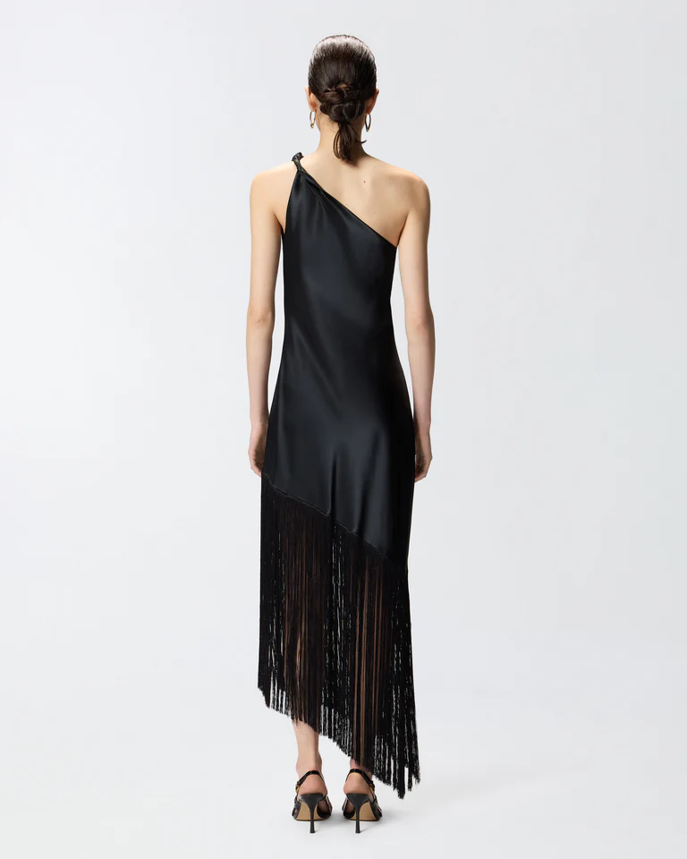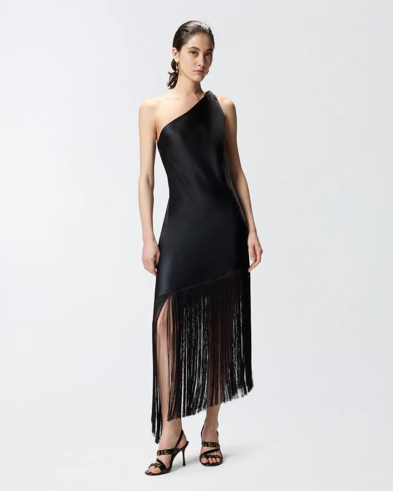 Abito corto con fondo asimmetrico e silhouette scivolata realizzato in un lucente e setoso satin. Il capo presenta un design monospalla senza maniche e con una spallina drappeggiata, ed è arricchito da lunghe e fitte frange sul fondo che ondeggeranno a ogni tuo passo. Grazie alla mano liscia ed elegante del tessuto e al carattere glamour e teatrale della decorazione, questo vestito è perfetto per trasformarti nella regina indiscussa di party esclusivi e occasioni speciali. Il modello è completato da una zip invisibile laterale per facilitare l’indosso.