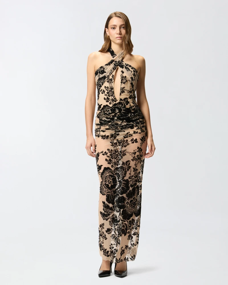 Abito lungo smanicato caratterizzato da fodera rimovibile, scollo all’americana e incrocio sul davanti, realizzato in tulle con una stampa d’ispirazione tapestry rinnovata in chiave moderna. Il tulle indemagliabile è un tessuto particolarmente resistente, che è stato sottoposto a uno speciale trattamento che consente alla maglia di non sfaldarsi in caso di rottura. L’effetto dévoré è ottenuto tramite una stampa flock che esalta il disegno floreale ricco di ramage e dettagli intricati, creando un gioco sofisticato che conferisce alla superficie profondità e una sensazione di tridimensionalità. Il contrasto tra la morbidezza della texture e la complessità del motivo floreale regala un impatto visivo e tattile di raffinata sensualità. Chiusura con zip invisibile sul retro.